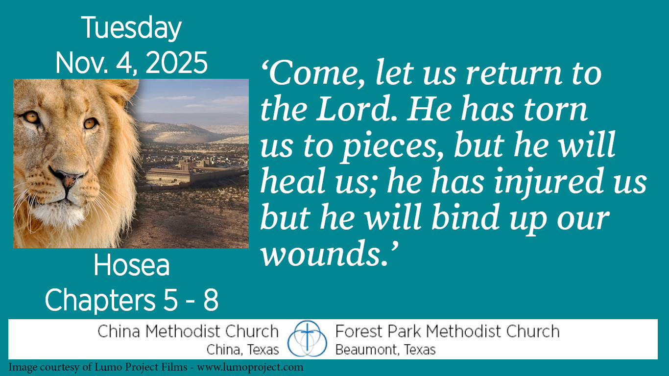 I don’t believe that “everything happens for a reason;” some things just happen. Here, though, Hosea makes it clear that sometimes bad times do come for a reason—sometimes bad times are sent by God. We can only assume those times are meant to cleanse or strengthen us, but in any case we are assured that, after the bad times, God will heal us and bind up our wounds.