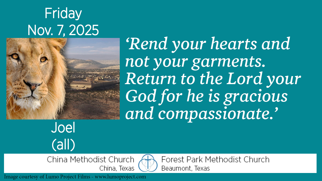 “‘Even now,’ declares the Lord, ‘return to me with all your heart, with fasting and weeping and mourning.’ Rend your heart and not your garments. Return to the Lord your God, for he is gracious and compassionate, slow to anger and abounding in love, and he relents from sending calamity.”