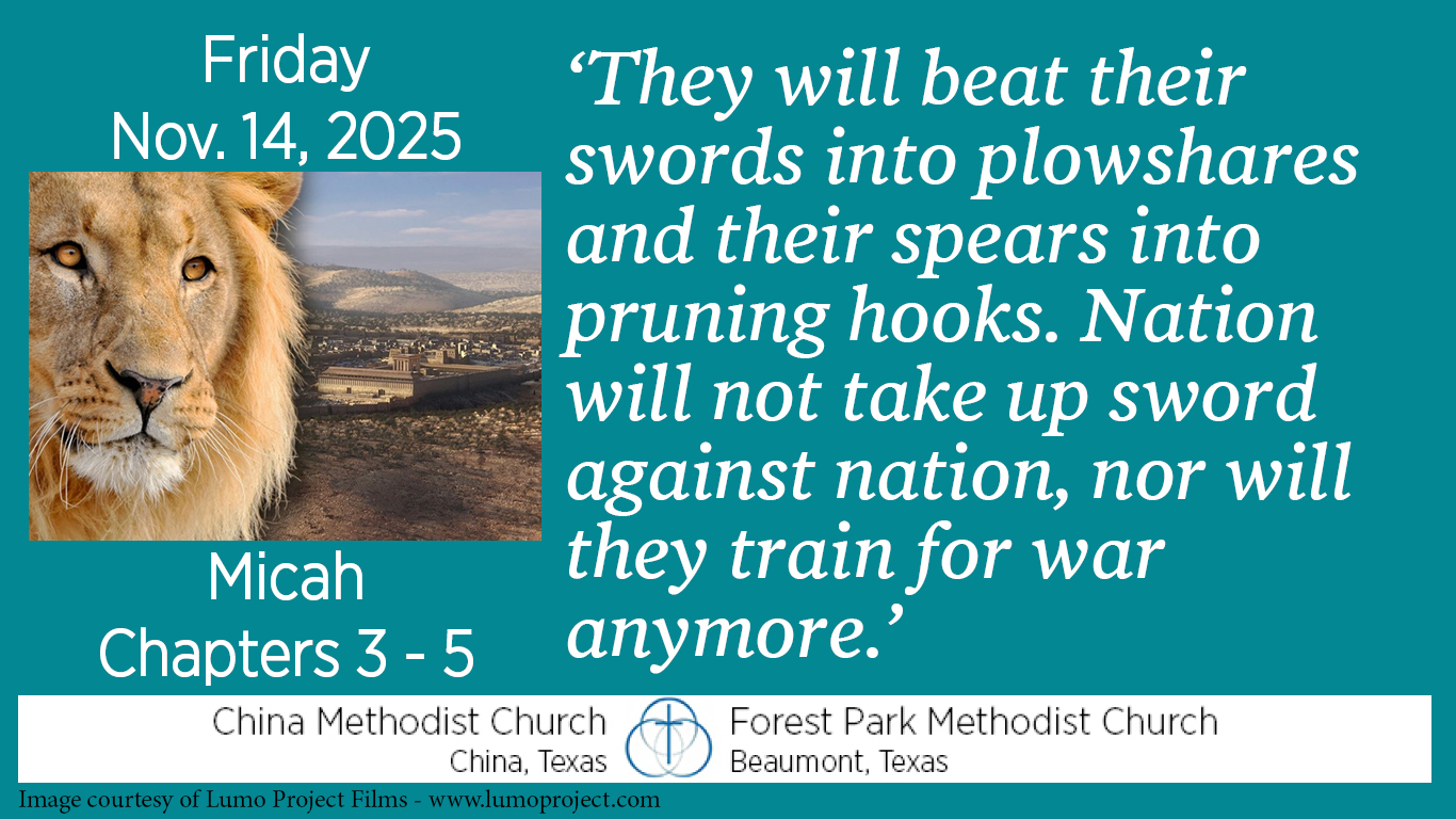 Some of the most hopeful words in Micah come in 4:3-4, which says, “He will judge between many peoples and will settle disputes for strong nations far and wide. They will beat their swords into plowshares and their spears into pruning hooks. Nation will not take up sword against nation, nor will they train for war anymore. Everyone will sit under their own vine and under their own fig tree, and no one will make them afraid, for the Lord Almighty has spoken.”