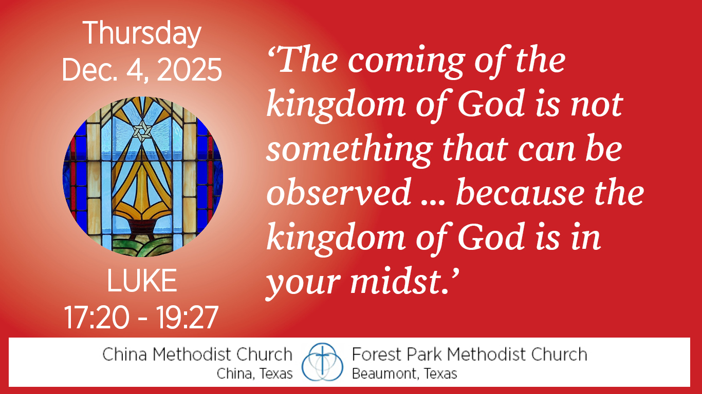 In 17:20-21 we read, “Once, on being asked by the Pharisees when the kingdom of God would come, Jesus replied, ‘The coming of the kingdom of God is not something that can be observed, nor will people say, “Here it is,” or “There it is,” because the kingdom of God is in your midst.’”