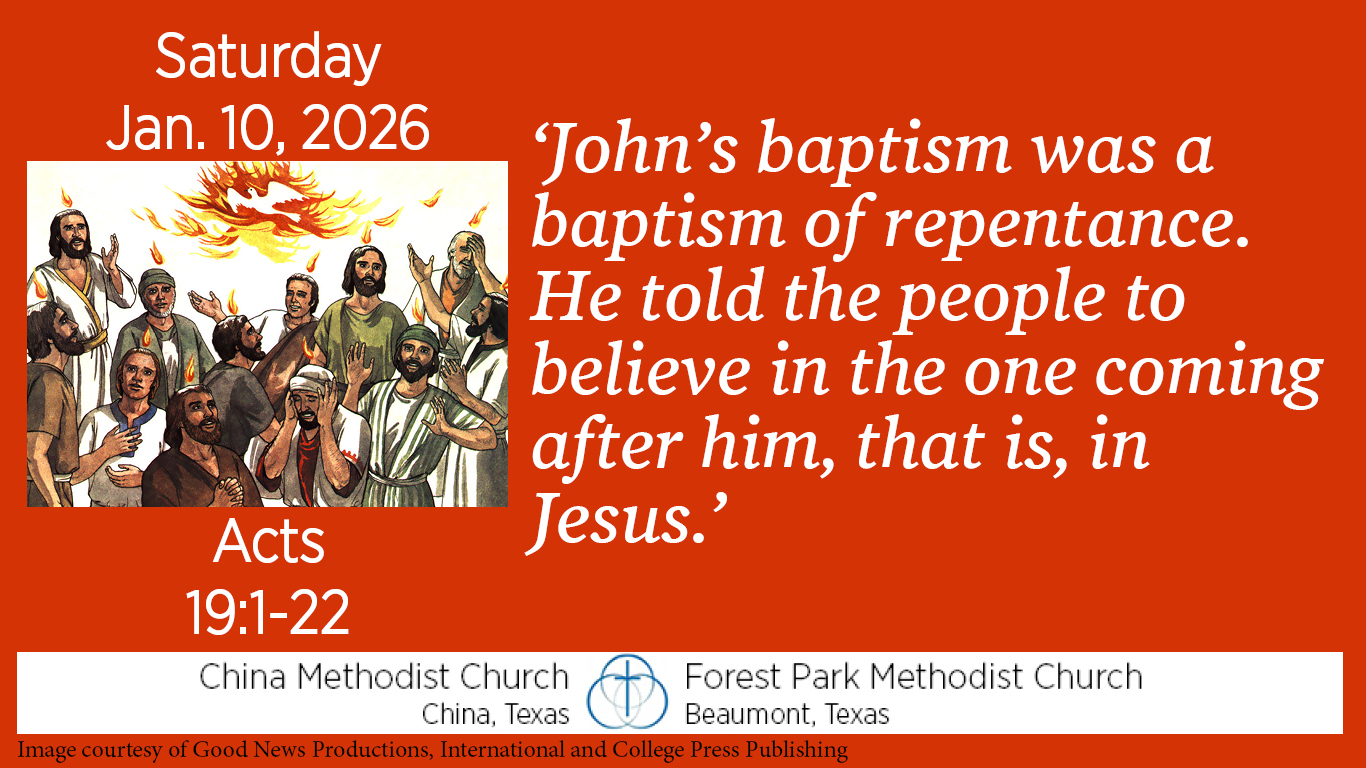 As he preaches in Ephesus, Paul asks believers there what baptism they have received. When they say they have received the baptism of John, Paul says, “John’s baptism was a baptism of repentance. He told the people to believe in the one coming after him, that is, in Jesus.”