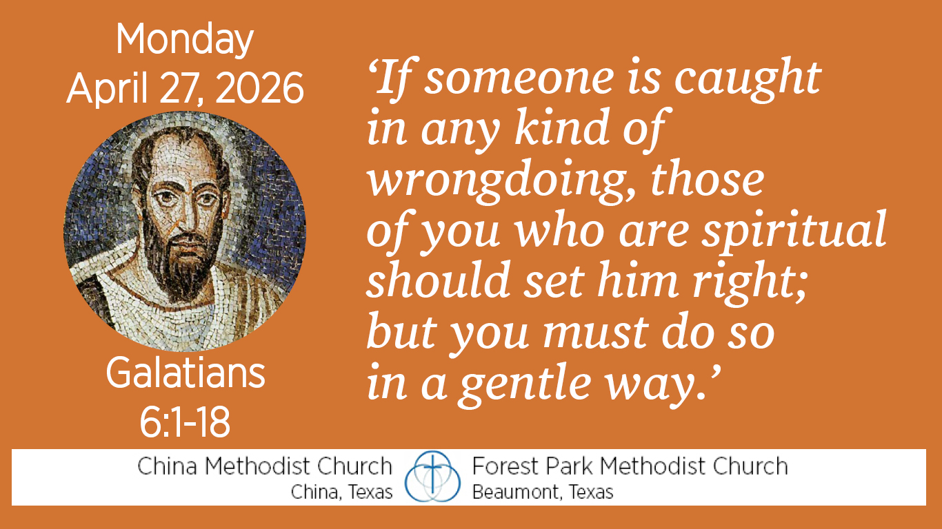 Chapter 6 begins with, “My friends, if someone is caught in any kind of wrongdoing, those of you who are spiritual should set him right; but you must do it in a gentle way….Help carry one another’s burdens, and in this way you will obey the law of Christ.”